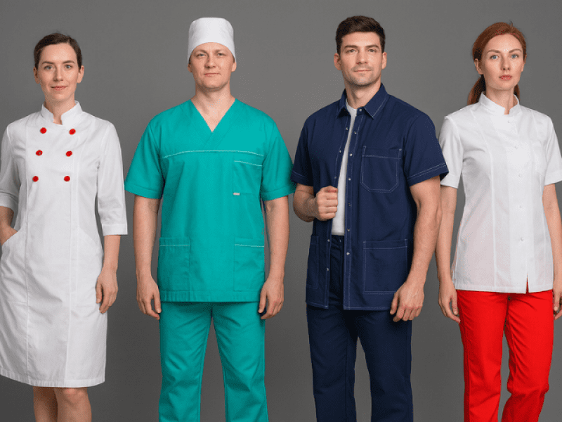 - Медицина: халаты, костюмы, скрабы, головные уборы;